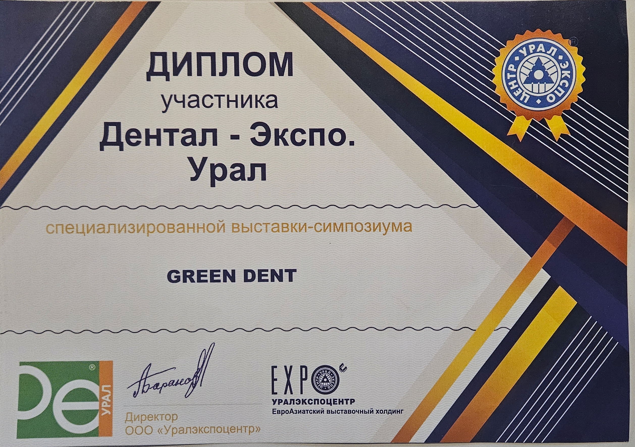 Диплом GREEN DENT за высокое качество и новизну продукции